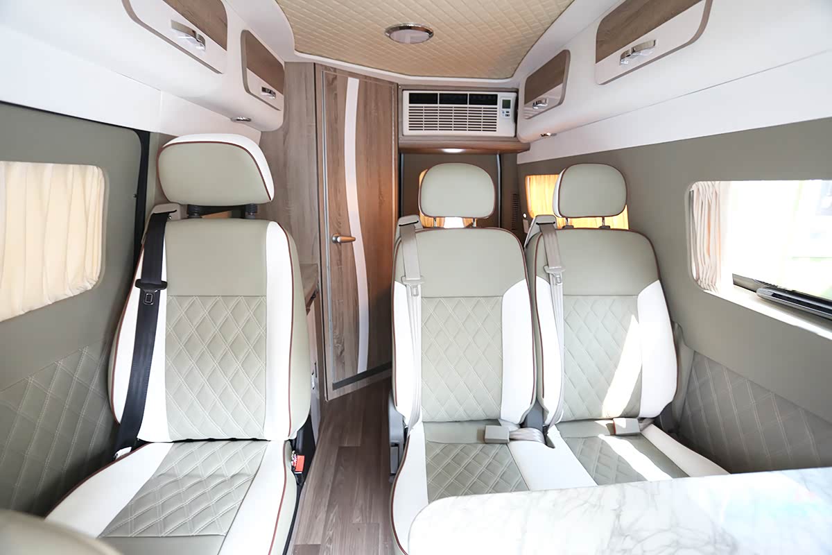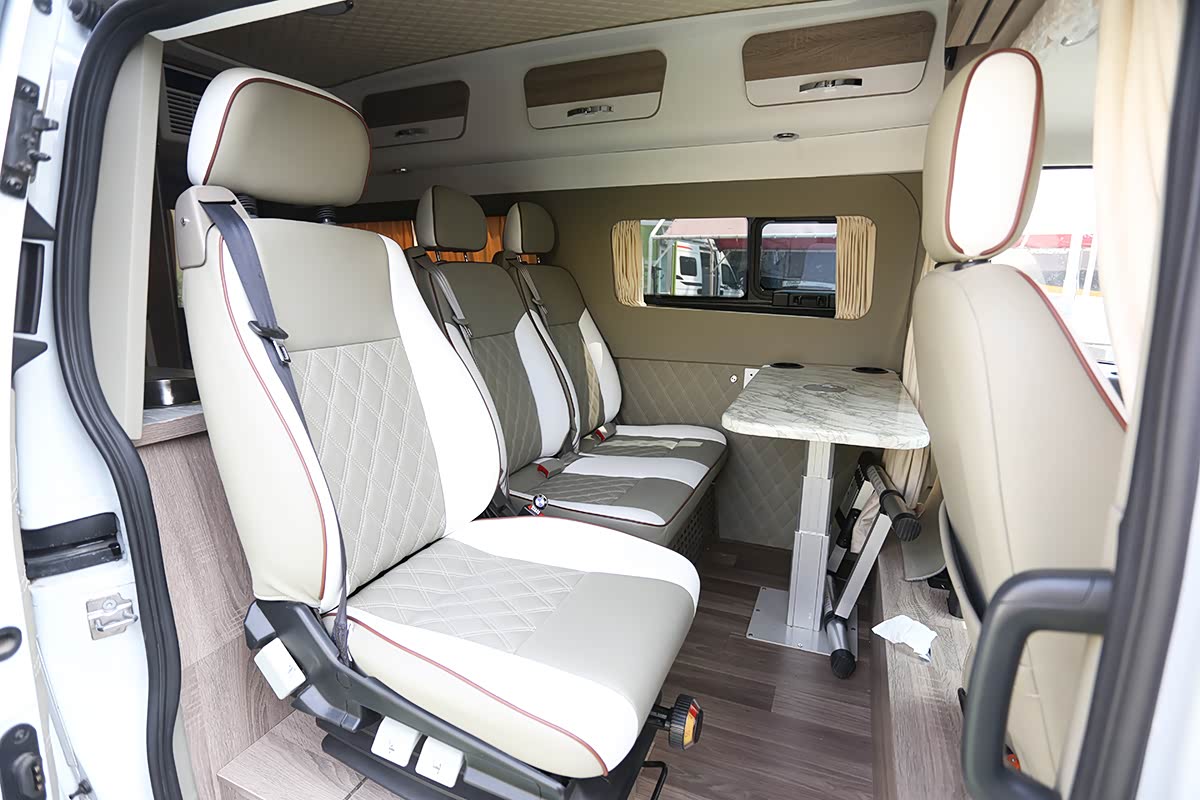驾驶室后方就是这款房车的生活空间,车厢前部的3个汽车座椅构成客厅区域,后方为卧室及厨卫区,同时车顶还隐藏有双人床铺,整车可住2-3人。水电方面,新车标配400Ah锂电池、2000W充逆变一体机、90升净水箱及45升灰水箱。