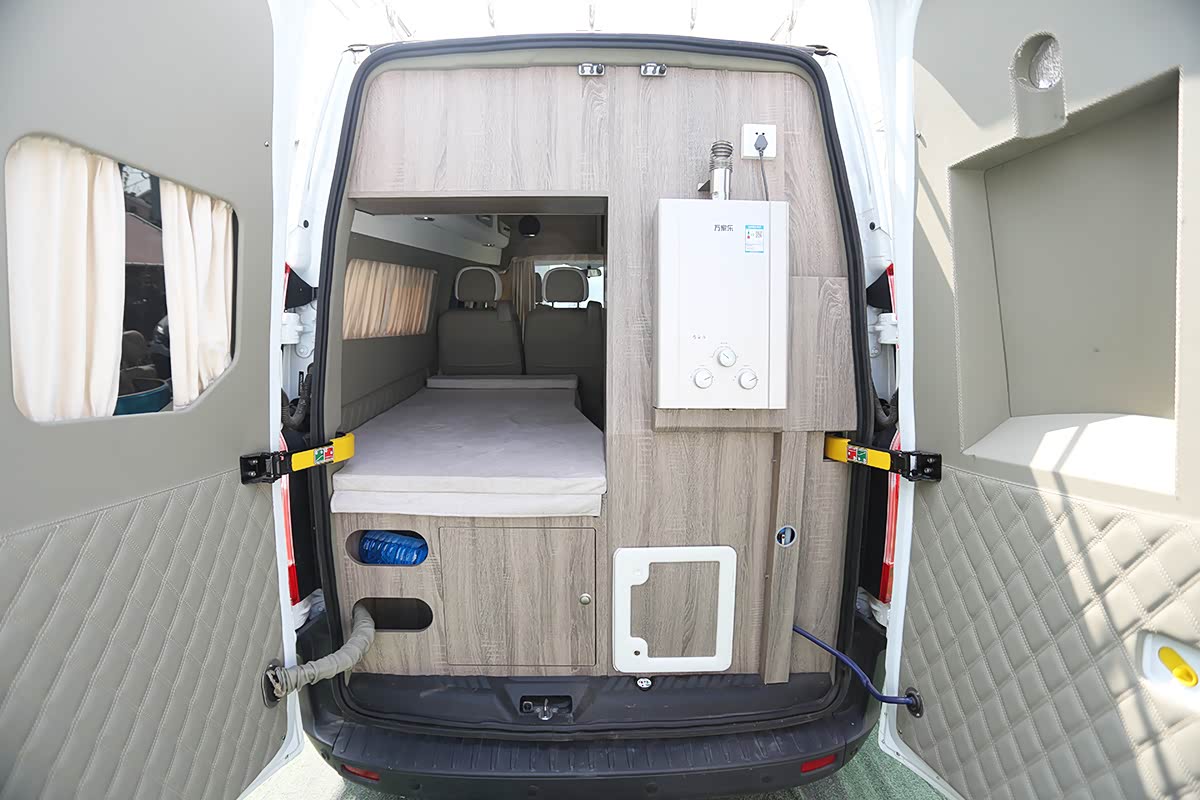 车尾门打开后,可以看到车尾是卧室区域,同时还可看到该车配备的6升燃气热水器。