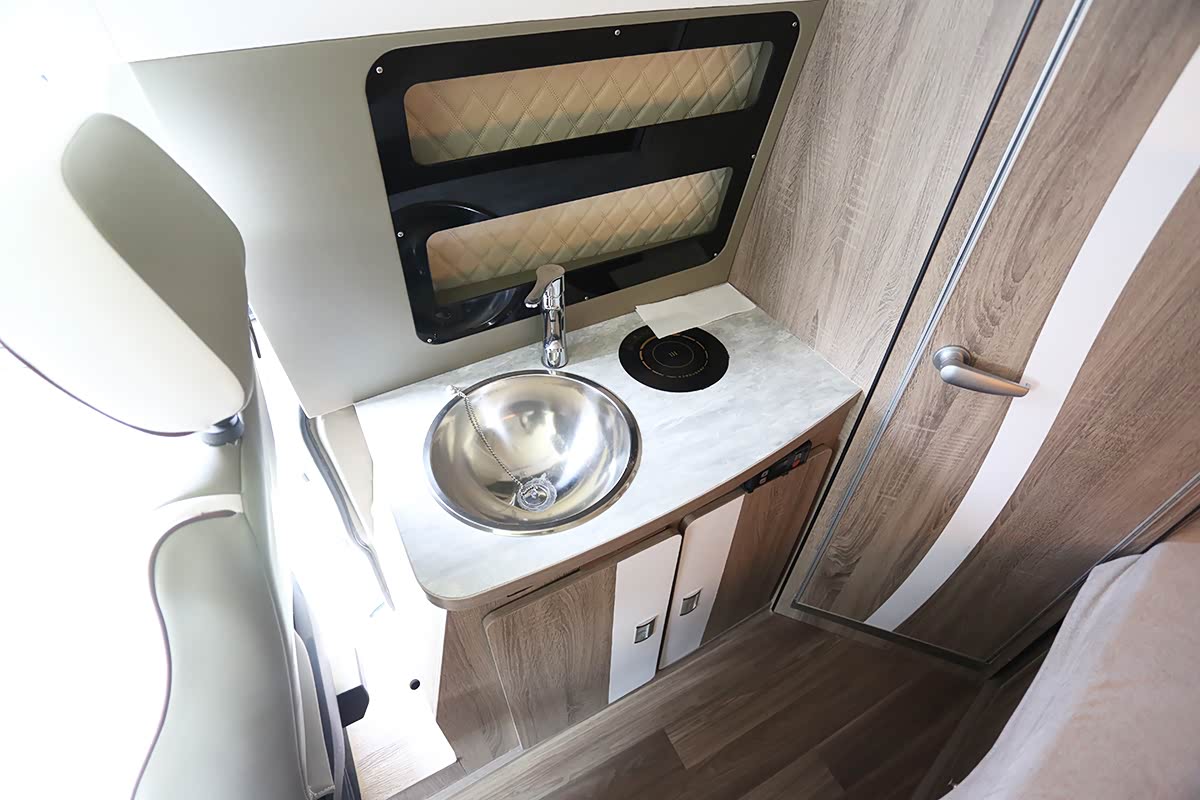 厨房区位于靠近侧拉门一侧,桌面上安装了圆形不锈钢洗菜池及800W电磁炉,车载冰箱容积为49升。