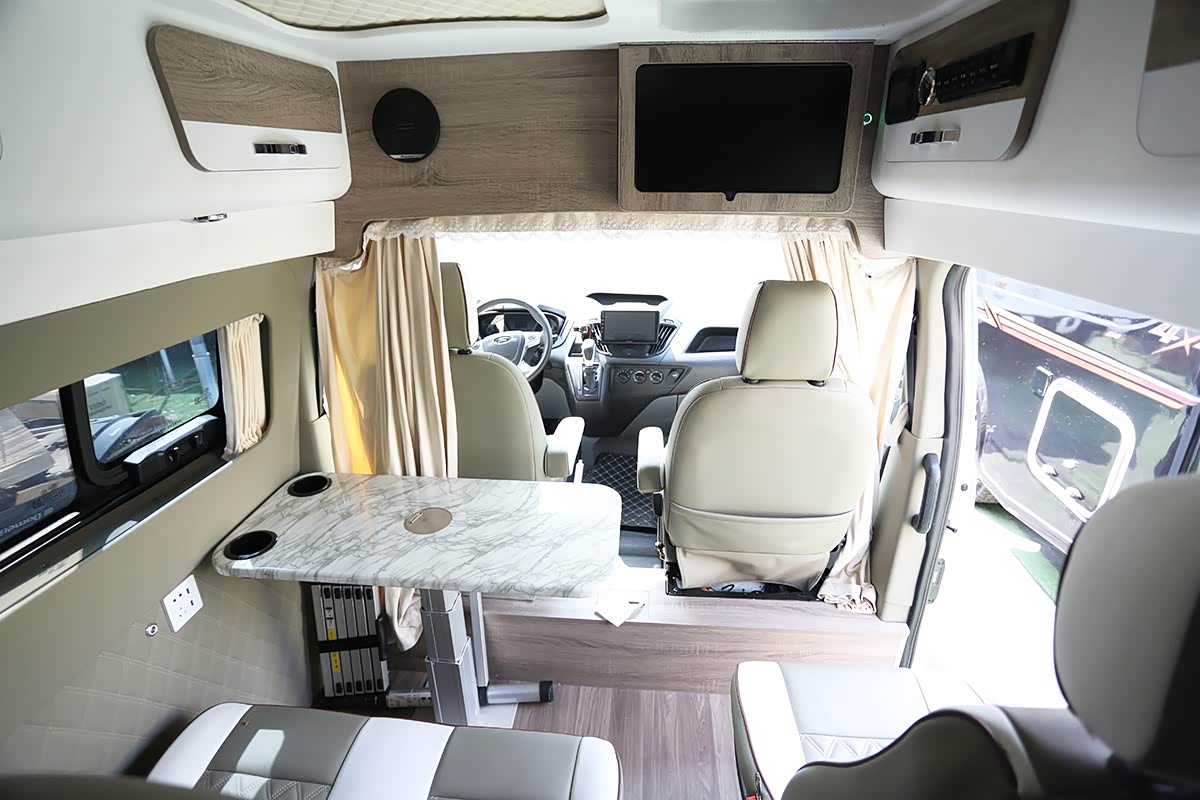 客厅区域也配备了餐桌,方便乘客在车内就餐,驾驶室上方还内嵌了22寸车载电视。
