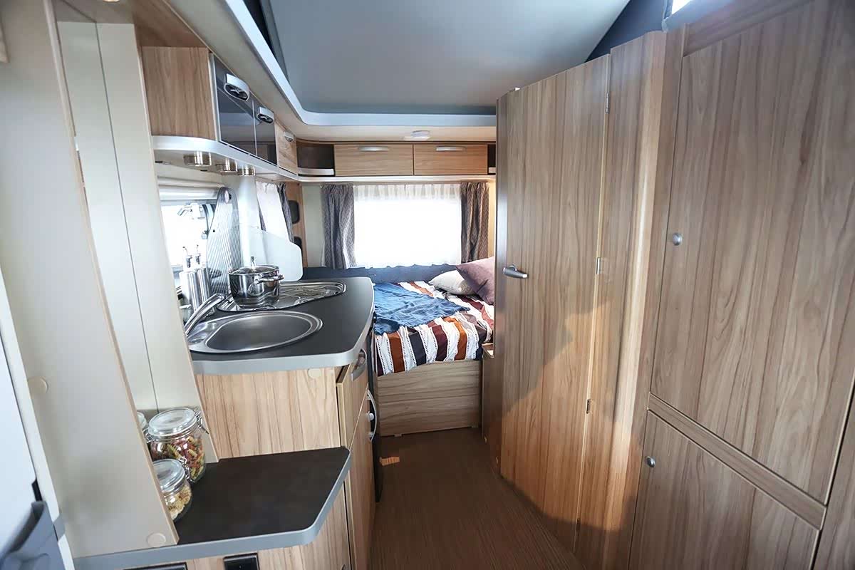 车内是正宗的欧式房车风格,家具采用浅色系的原木纹理板材,通过合理的车窗布置实现明亮的采光效果。车内空间方面,内高为1.98米,内部宽度为2米,车厢长度为4.86米。