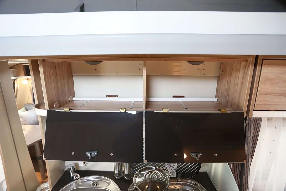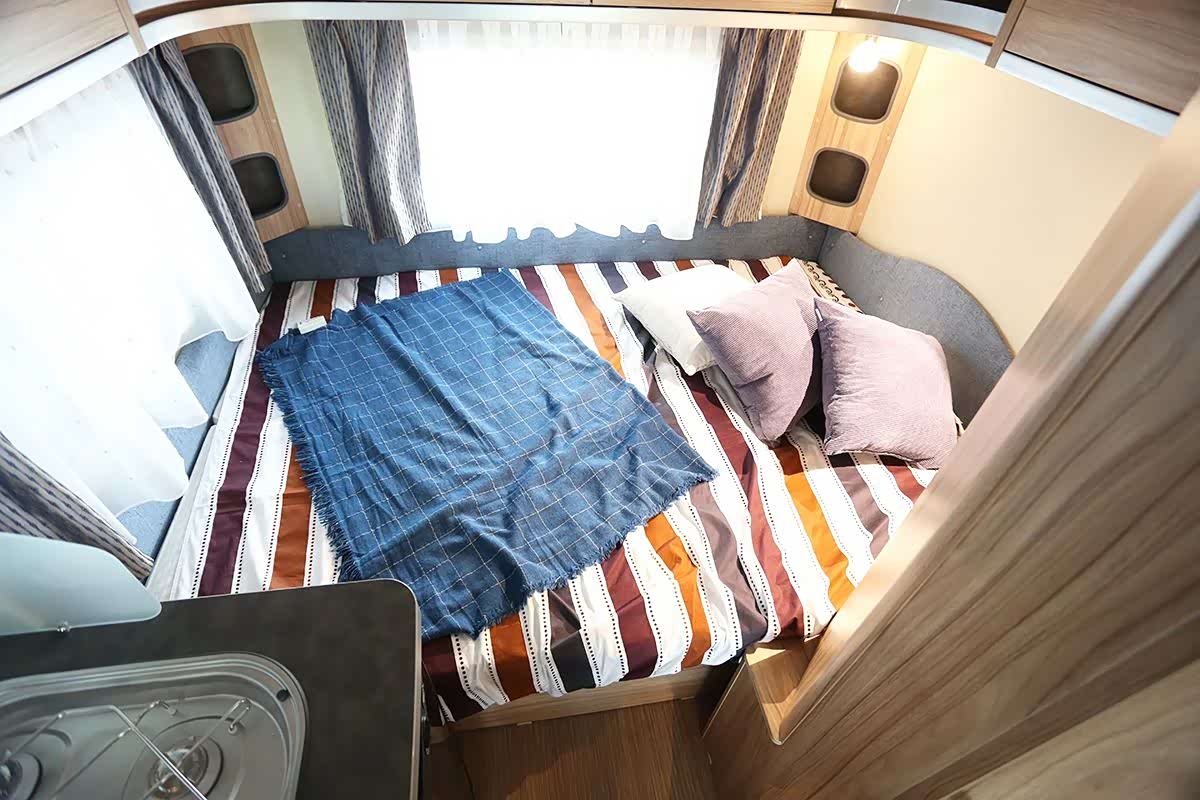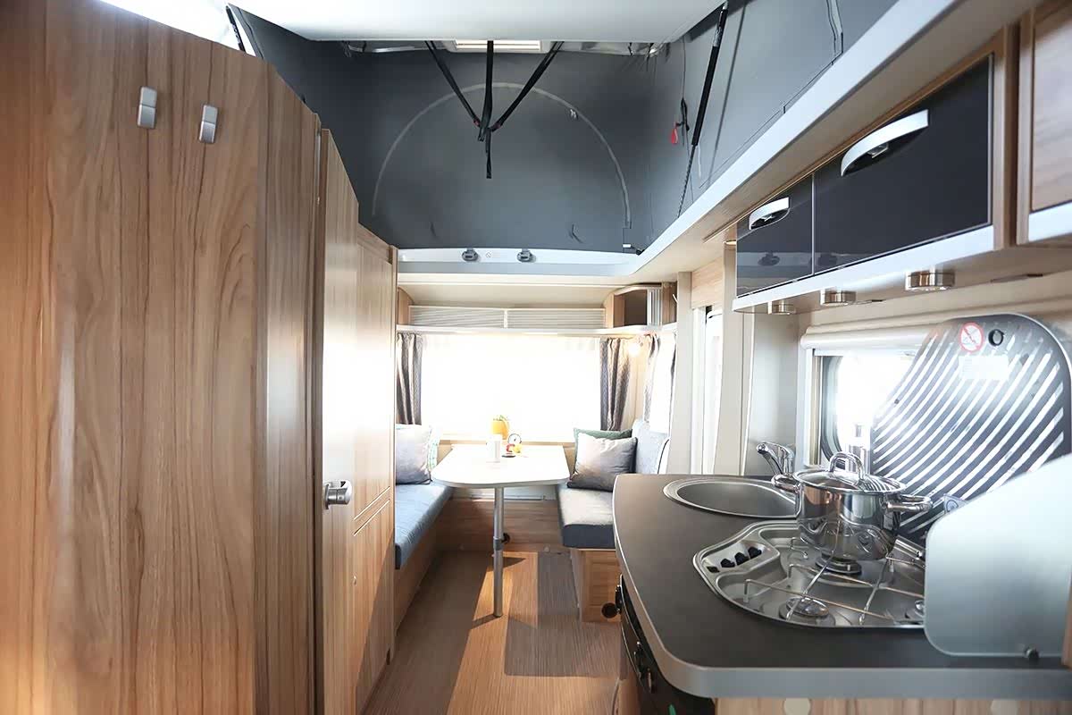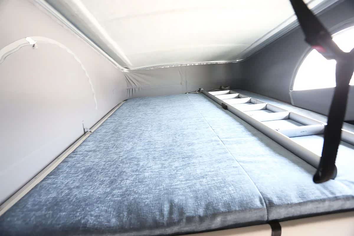 车顶升起后是一张双人床铺,升顶机构采用液压拉杆,另外在不使用车顶床时,床板也可向上翻起,提供更充足的头部空间。