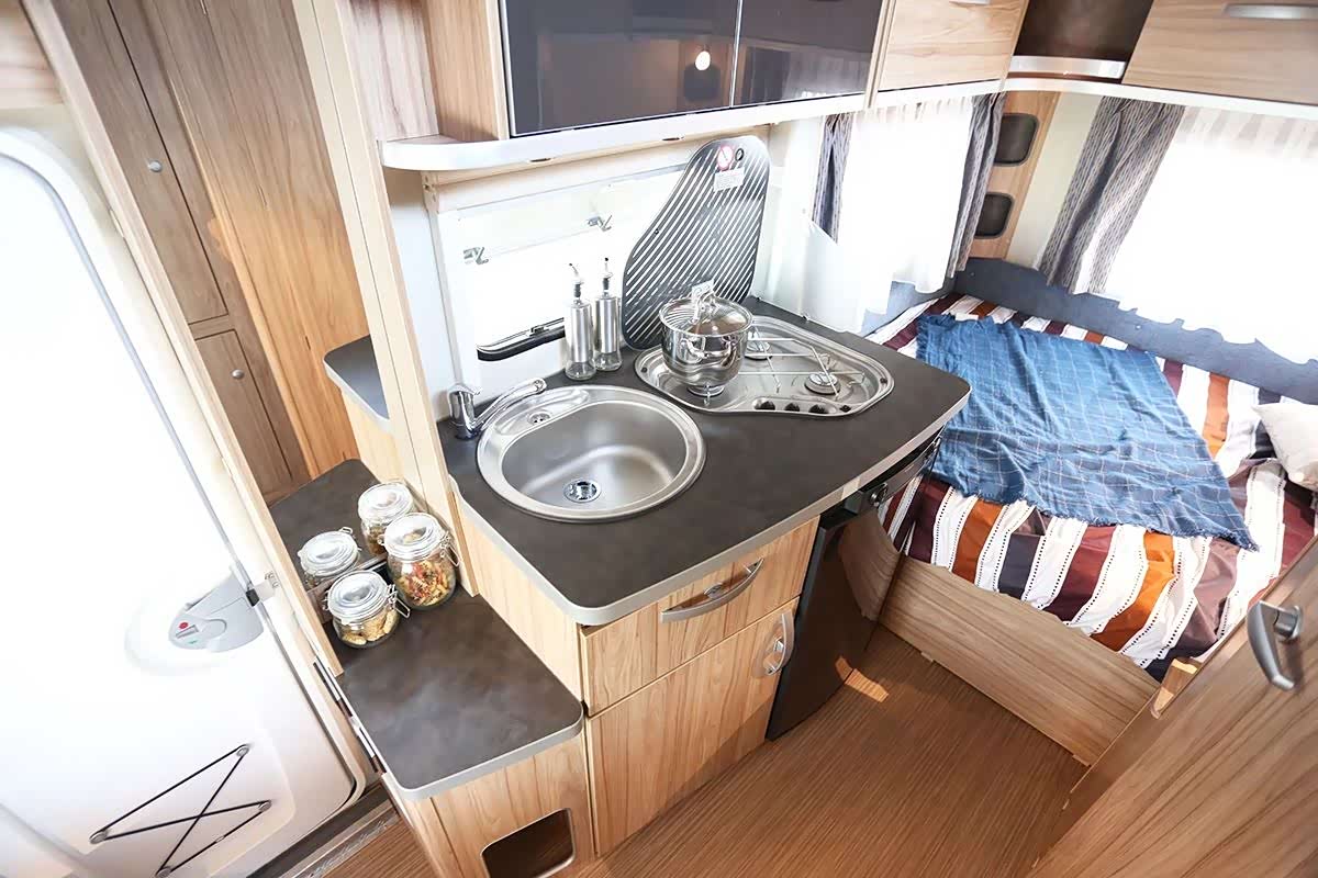 厨房区配备了3 点式灶台,带自动点火装置并配有防火保护装置和炉灶玻璃盖,灶台左侧为洗菜池,同样为不锈钢材质。