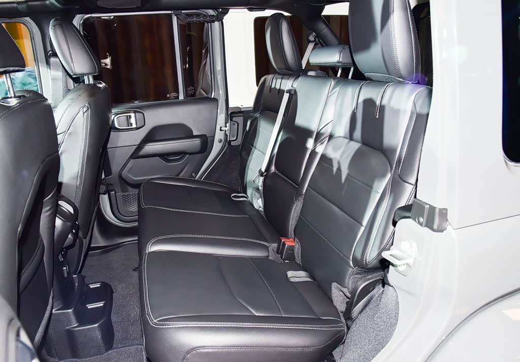 牧马人4xe先行版的后排空间比较宽敞,难得的是它地板中间的凸起也比较低,长时间户外出行,后排乘客也不会觉得憋屈。不过座椅的材质和手感整体偏硬,也不太符合人体工学设计,舒适度方面打了折扣,这是不少硬派SUV的通病。