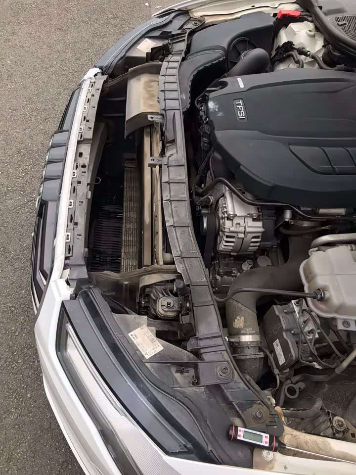 下面看的更清楚,胖虎把机舱上面的护板拆下来,前面的水箱、空调冷凝器、水箱框架等部件都完好无损,进一步排除前部事故的嫌疑。