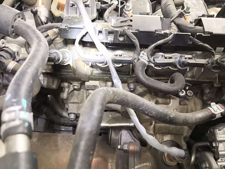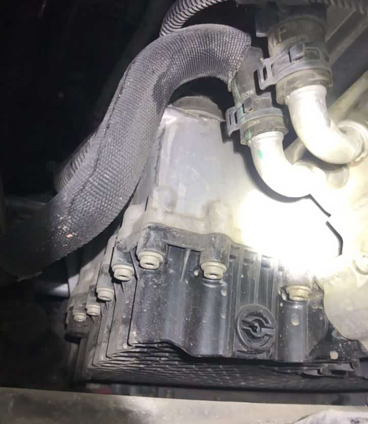 来看发动机的情况,气门罩盖垫有轻微的渗油,这都是小问题,后期渗漏严重了拆下来换一个垫子即可。对于德系车来说,不渗油的那基本是少之又少了,都是通病,不管你是奥迪还是宝马。