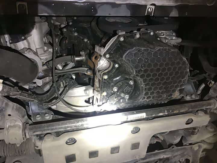 底盘护板已经拆了下来,发动机底部非常的干净,未发现螺丝拆卸维修渗油等问题,这块可以说是非常的完美。