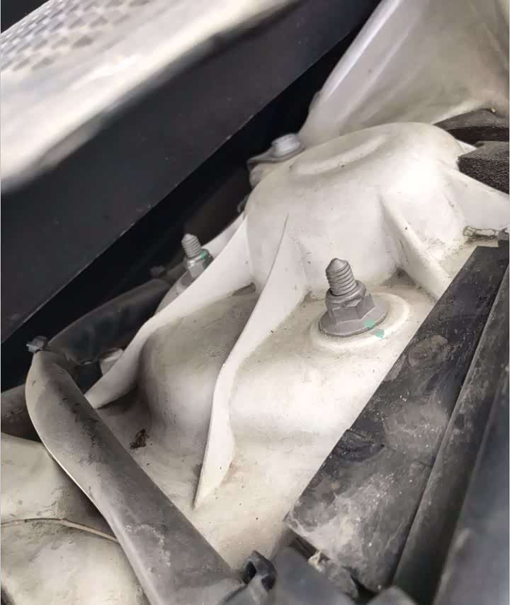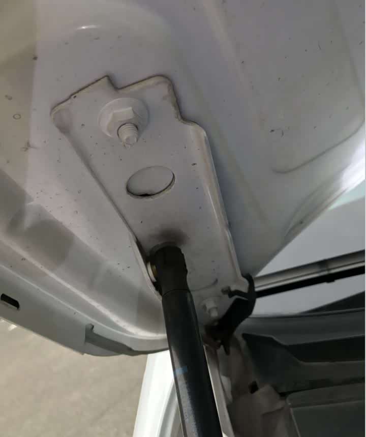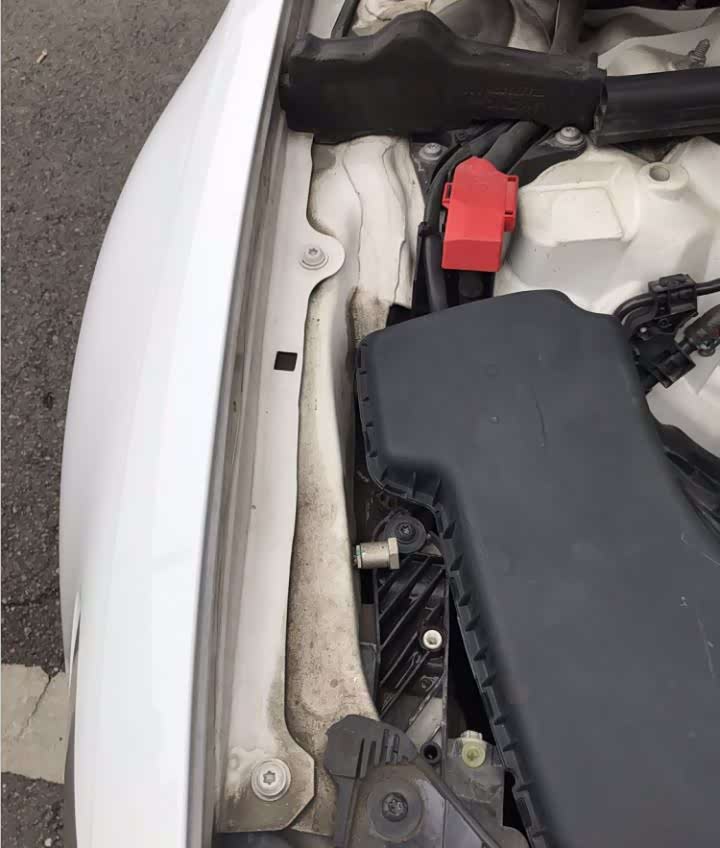 接下来我们对左右减震器塔顶进行了检测,周边的焊点及胶线也是完好状态,螺丝也没有动过的迹象。