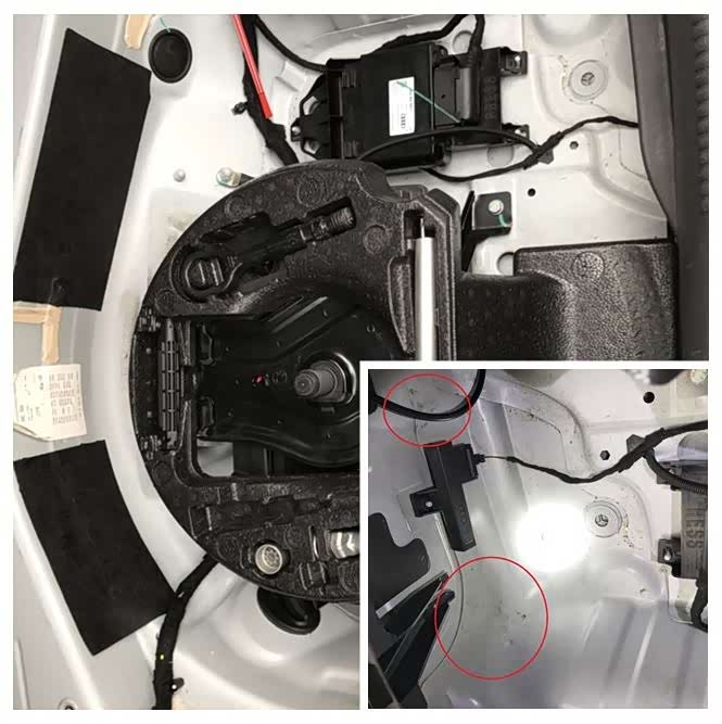 后尾盖更换了,说明后部有过不小的撞击,那么车尾的检测就要小心了。查看备胎槽各个角落,没有发现切割烧焊的痕迹,但是备胎槽有一块核桃大小面积的变形。看来尾部事故并不是很严重,对于车辆的行驶安全也没有任何的影响,但是备胎槽属于车身框架结构的一部分,按照国标定义,可以认定为事故车的。