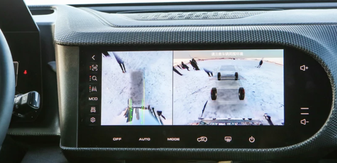 雪地模式下,四驱系统会使前后桥扭矩实现50:50的分配,而当遇到某个驱动轮打滑时,中央差速锁将介入,负责把扭矩传递到有效车轮一侧,使得车辆获得较大的驱动力,从而脱困。而这一系列动作操作的速度非常快,基本在你刚感受都打滑的时候,电子限滑和差速锁就已经开始工作了。因为我们这一路并没有遇到特别大难走的炮弹坑,所以,后差也没用上(这个锁只能在沙地或者泥地模式下启动)。
