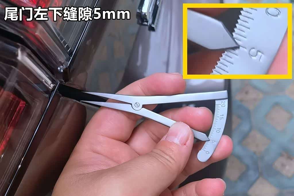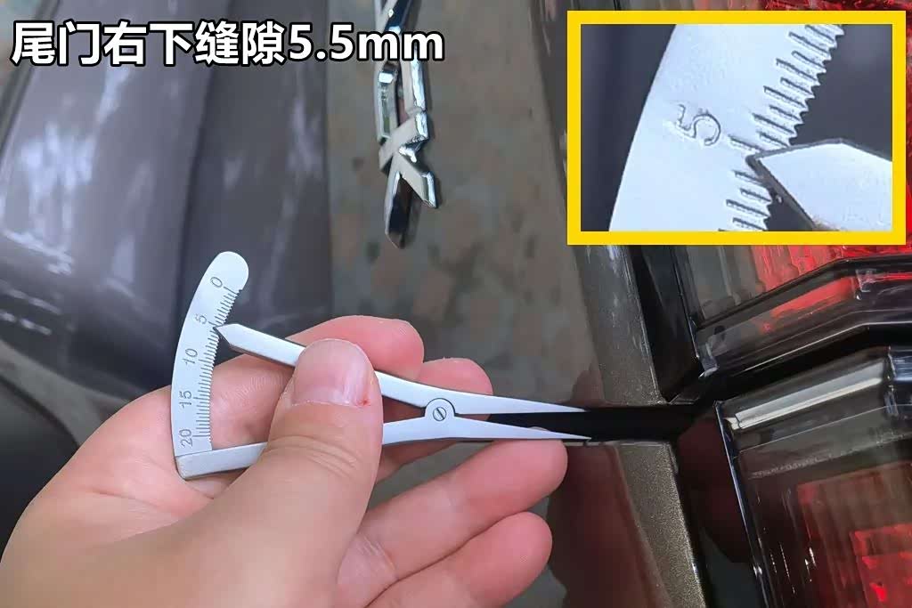 我们在傲虎上选取的钣金缝隙测量点共有4对8组,分别是引擎盖靠近A柱下端左右缝隙、引擎盖前端靠近大灯的左右缝隙,尾门上端靠近挡风玻璃的左右缝隙,以及尾门下靠近尾灯的左右缝隙。基本上这一组数据就能反映出这款车的整体钣金工艺。