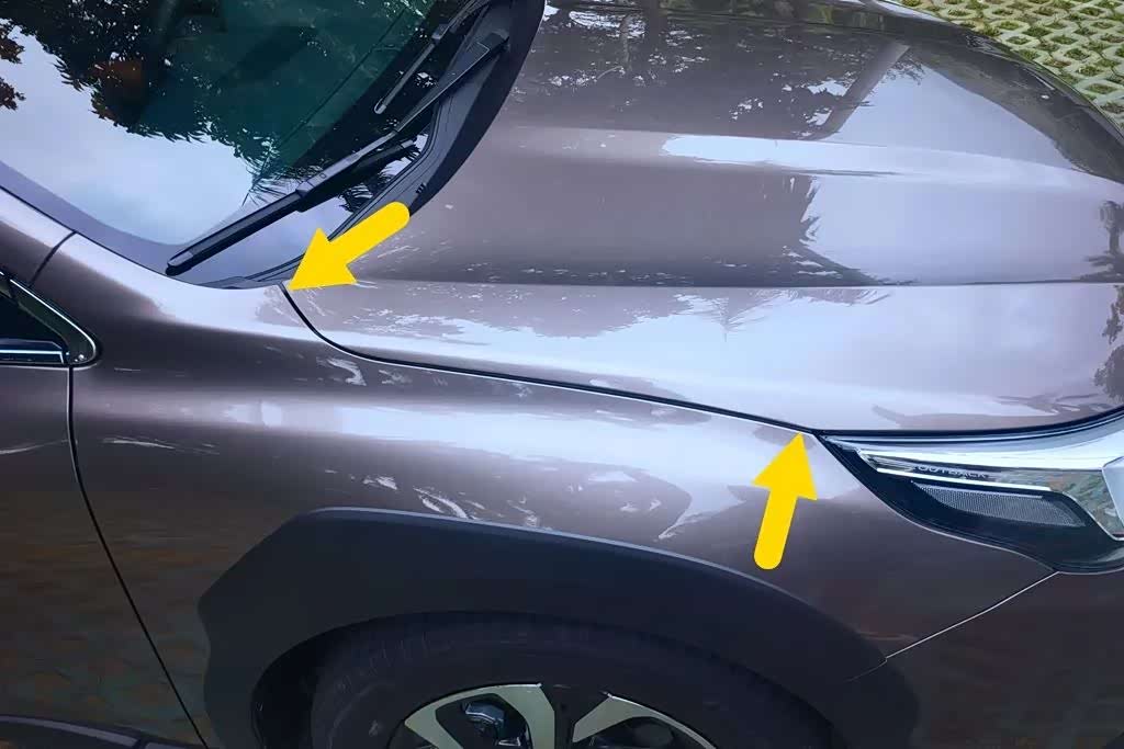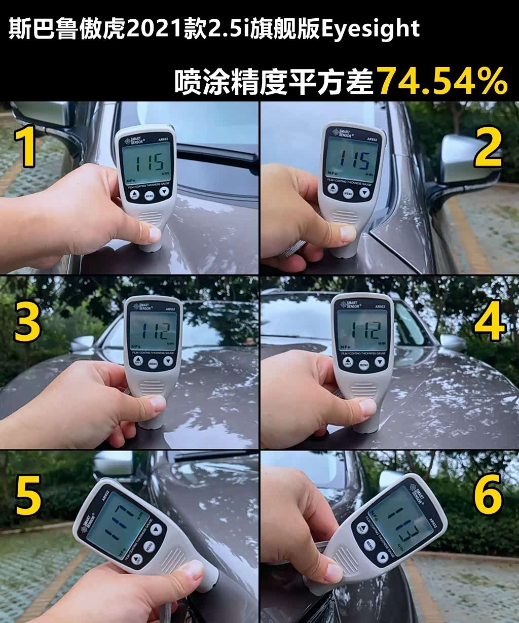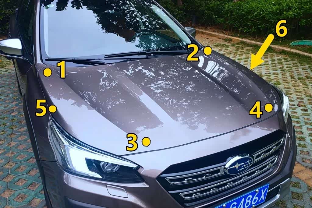 由于前机盖是全车最大的一个钣金面,所以我们特地选择引擎盖上的6个点进行车漆厚度测量。其中1对测量点位于引擎盖两侧的冲压折边上。基本上这一组数据就能反映傲虎的车漆整体工艺水准。