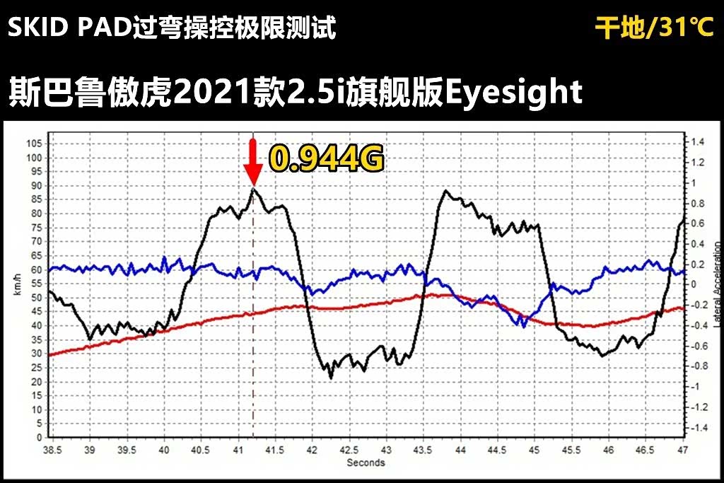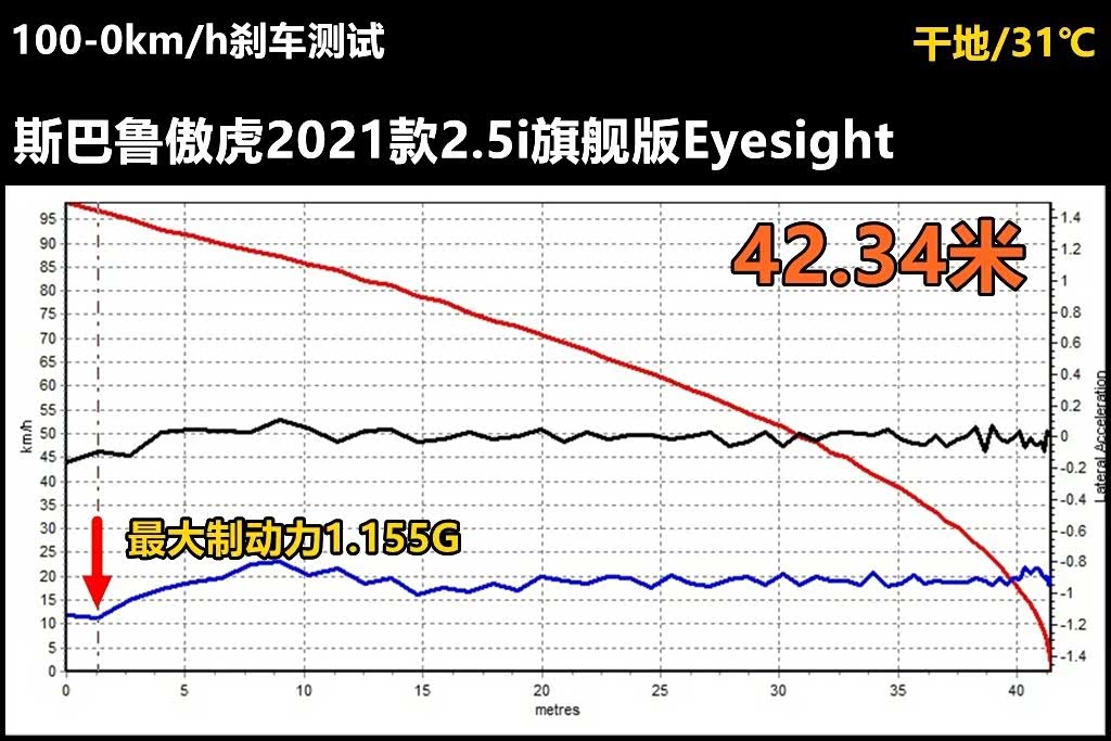 傲虎的5次100-0km/h刹车平均成绩为43.40米,最好成绩42.34米——这个成绩表现一般,但是从图上看,车身稳定性(黑色曲线)相当不错,制动力输出曲线(蓝色曲线)尤其平稳,也是妥妥的舒适性路线。傲虎刹车偏长似乎是斯巴鲁有意调校的结果,证据就是初段最大制动力仅有1.155G,这在“Lab测试”历史上算是偏小的。