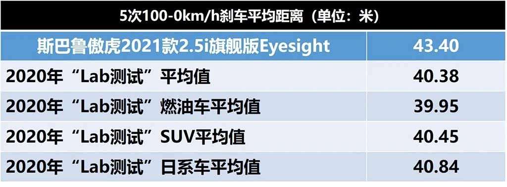 我们针对2020年测试过的所有车型,统计了各个细分市场的刹车表现平均数据,傲虎的5次刹车平均成绩均落后于所处的细分市场。