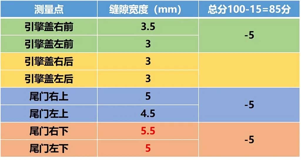 只能说,傲虎的钣金工艺一般,和丰田车差不多,在中国市场属于中游水准。4对测量点,有3对出现0.5mm误差。