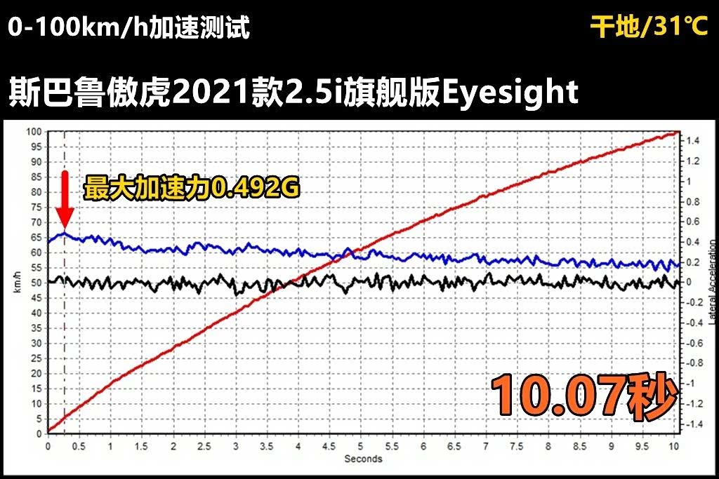 在5次0-100km/h加速测试中,傲虎跑出了10.07秒的最快成绩。从图上看,最大加速力其实不大,而且也没有跑进10秒内,这套动力系统谈不上生猛,但绝对说得上是舒适。不过有意思的是,这套CVT变速箱一开始就可输出最大加速力,居然可以弹射起步,弹射起步速度达到了1.21km/h——全时四驱的起步表现果然了得。