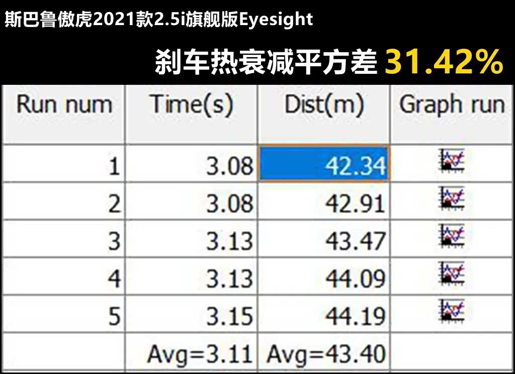 傲虎5次刹车可以从刹车距离上看出有明显的递增,算下来其热衰减平方差达到31.42%——按照我们的分级,刹车热衰减平方差≤25%算完美,≤50%算优秀。所以,这套刹车系统离完美只差6.42%。