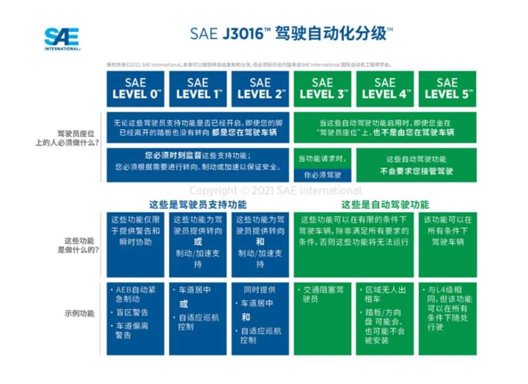 日前,国际汽车工程师学会(SAE)更新了自动驾驶的等级定义,作为行业新的通用准则。关于自动驾驶的等级定义SAE J3016,此次更新主要以澄清L2级和L3级之间的差异,在满足驾驶辅助和主动安全功能越来越丰富的情况下,对“驾驶员辅助系统”和“自动驾驶系统”的区分。