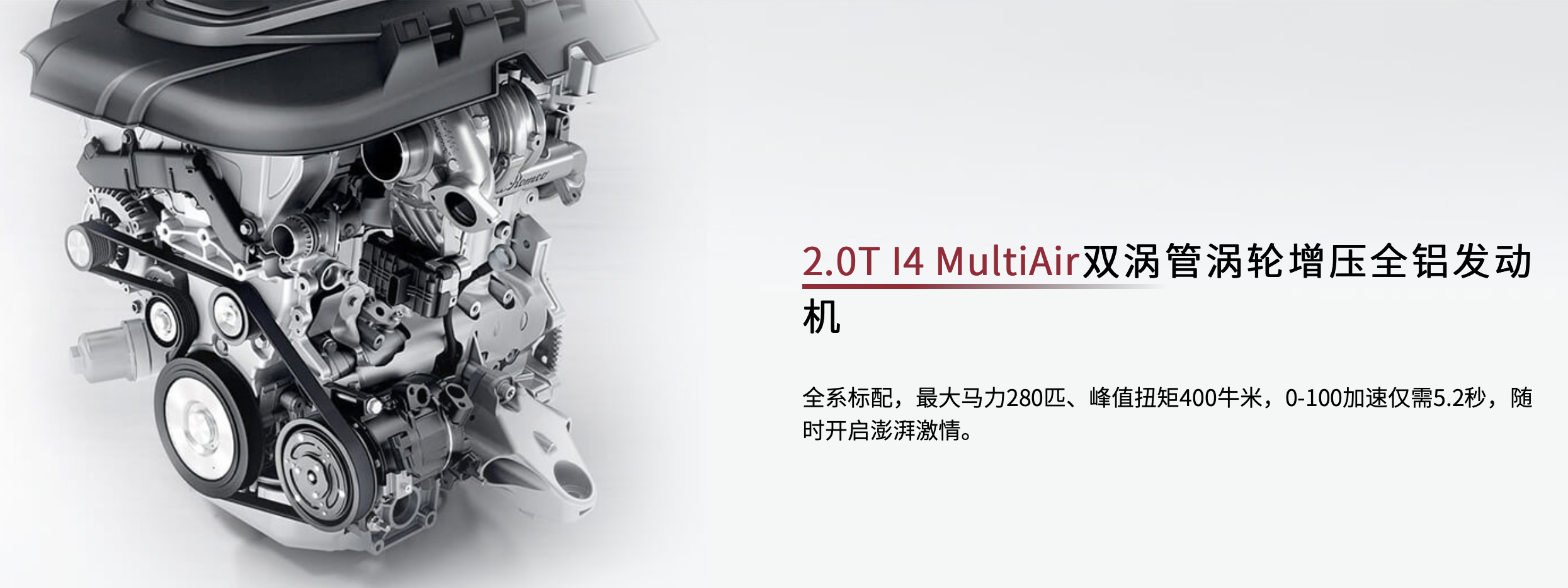 只因它是FCA集团的下的产物,消费者对于它的可靠性还是有所保留,但这往往忽视了这台发动机的过人之处。FCA独有的MultiAir技术加持之下,使得这副2.0T发动机它的效能变得更加的高效,涡轮迟滞变得更小了,低扭也变得更强了,燃油的经济性也进一步得到提升。