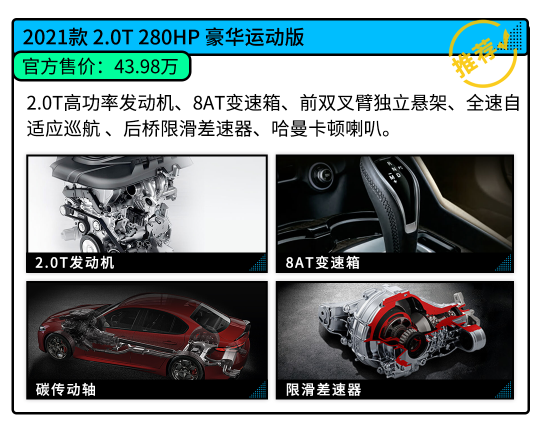 买买君本人很少会直接推荐高配车型的,但面对Giulia这款车,个人认为较为值得购买的它的2.0T高配车型。原因在于它配备了后桥限滑差速器,这项配置对于普通轿车而言,是可有可无的,但对于阿尔法·罗密欧Giulia这种运动型轿车而言,是如虎添翼的存在。