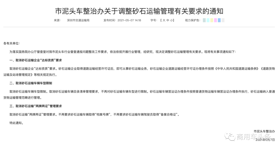 5月7日,深圳市交通运输局发布《市泥头车整治办关于调整砂石运输管理有关要求的通知》。通知共分为三个部分:明确取消砂石运输企业“达标资质”要求;取消砂石运输车辆车型限制;取消砂石运输“两牌两证”管理要求。