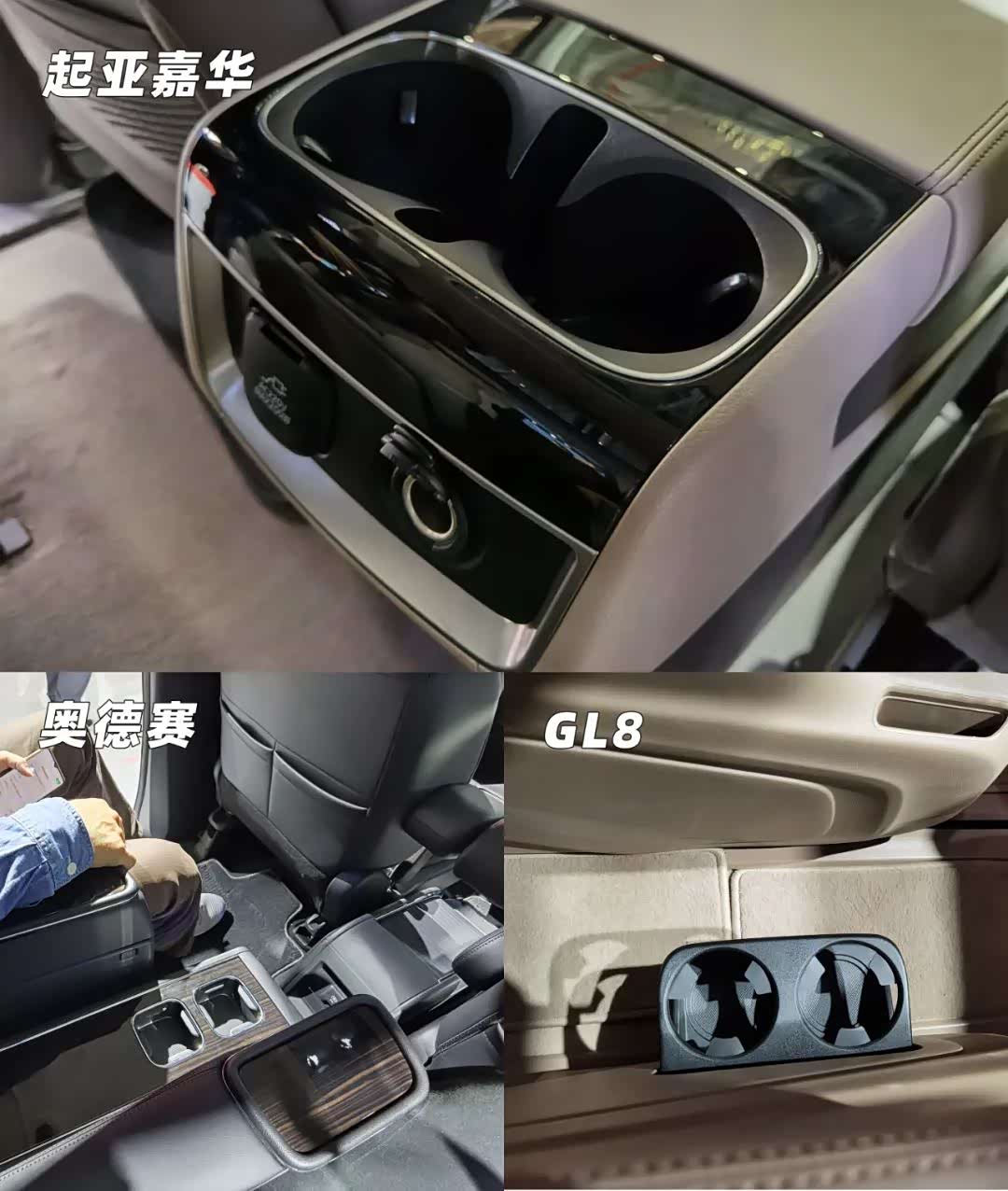 嘉华的第二排杯架位于中央扶手箱后方,奥德赛和GL8的杯架都在第二排右边座椅的内侧,奥德赛是翻折式,GL8是弹出式。