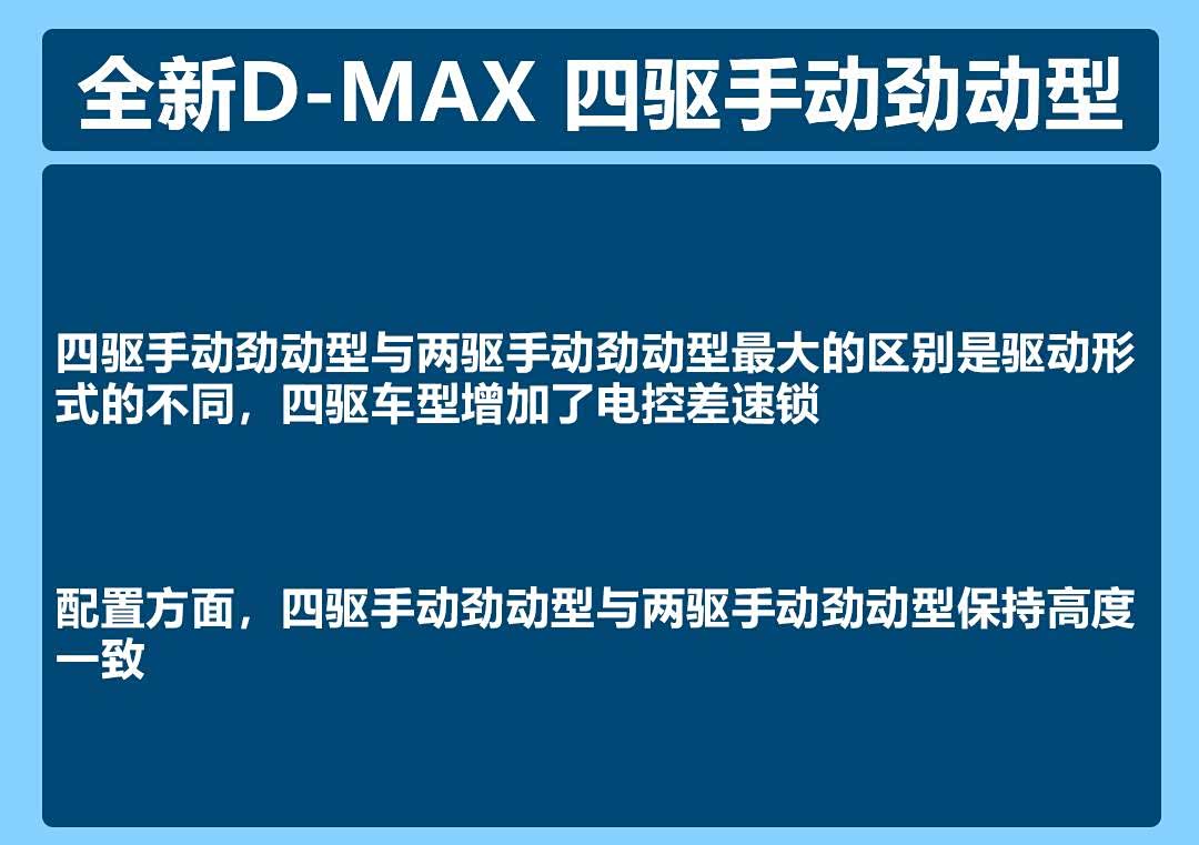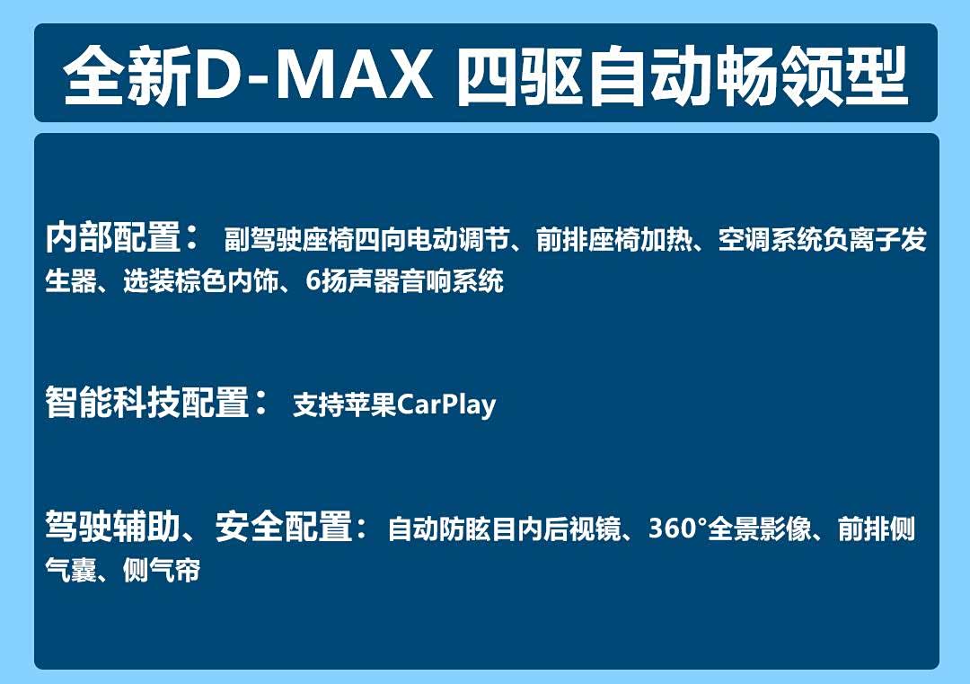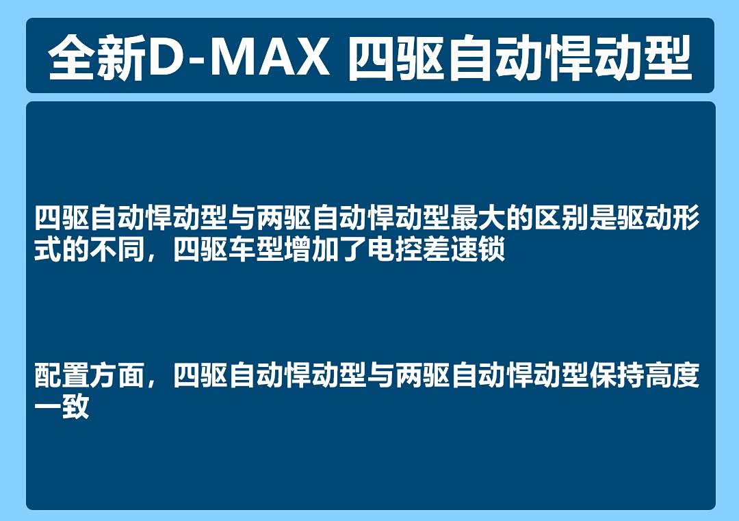纵观五十铃D-MAX的各个配置,我们不难发现,四驱自动畅领型是其中各方面素质较高的车型。它不仅提供了一套四驱系统,满足了我们对车辆通过性、轻度越野的需求,还提供了定速巡航以及更全面的安全配置。除此之外,四驱自动畅领型还提供了负离子发生器、主副驾驶电动调节、前排座椅加热等,既满足了我们日常驾驶需求,又给足了我们充足的驾驶体验,同时价格上也比较有竞争力。综合下来,编辑更推荐大家选择四驱自动畅领型。