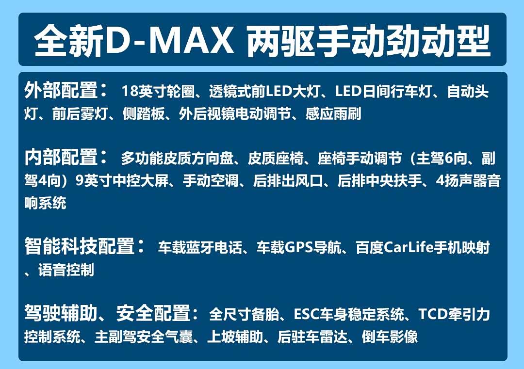 从配置上分析,全新五十铃D-MAX为入门级车型就提供了丰富的配置,已基本上可以满足我们日常驾车需求。外部配置,两驱手动劲动型提供了18英寸轮圈、透镜式前LED大灯、LED日间行车灯、自动头灯、前后雾灯、侧踏板、外后视镜电动调节、感应雨刷,相当丰富。内部配置,其提供了多功能皮质方向盘、皮质座椅、座椅手动调节(主驾6向、副驾4向)9英寸中控大屏、手动空调、后排出风口、后排中央扶手、4扬声器音响系统等。