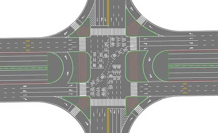 全方向待行区其实就是在交叉口四个方向都划分左转和直行待行区,方便左转和直行车快速通过路口,提高整个路口的通行能力!