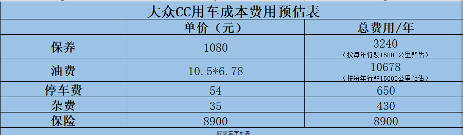 根据表格中可以算出,大众CC一年用车总成本约为23898元,平均每月约为1991元(数据仅供参考,实际费用与使用人情况以及当地油价有关,可能存在差异)。如果你觉得这样的价格可以接受的话,就可以放心入手大众CC。