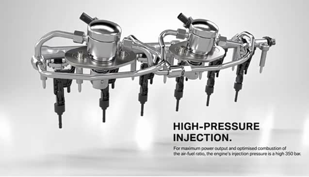 在发动机内部,除了采用宝马引以为傲的双VANOS可变气门正时系统、Valvetronic可变气门升程系统以外,还应用了350Bar的燃油直喷系统,通过精准的控制策略,在低负载工况下拥有较好的燃油经济性,而在高负载工况下,能够有效控制汽缸工作温度,使其保持稳定的高功率输出。