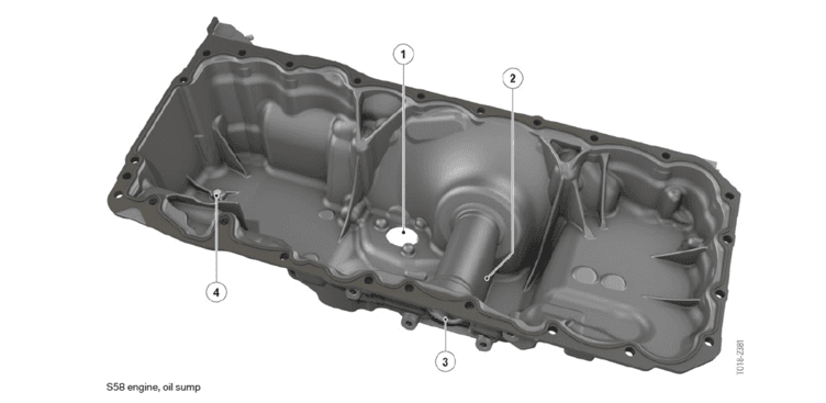 油底壳与上一代S55系列发动机相同,均采用镁合金材质制造。但是在结构上汲取了赛车技术,采用双腔式和一个集成式吸入通道的设计。工作原理是油泵先从较小的腔室中获得稳定流量的润滑油,而当需要更多流量时再从大容量腔室中获取。使得发动机在仅需7L机油量的前提下,可在发动机高负载工况或车辆在极端的横向(1G)或纵向(1.3G)加速度中获得稳定且高效的机油润滑效果。