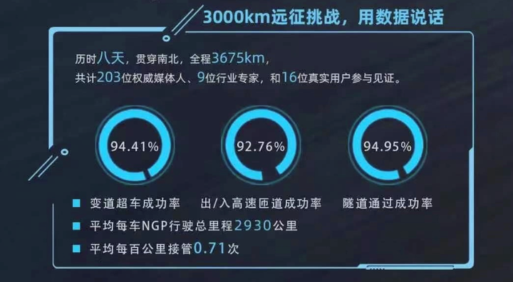 在这次体验营之前小鹏组织的从广州到北京里程共计3675km的NGP远征挑战,完成后得到了几项具体数据,变道超车成功率为94.41%,出/入高速匝道成功率为92.76%,隧道通过成功率为94.95%,平均每百公里人工接管0.71次。