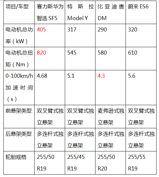 在动力上,赛力斯华为智选SF5在同级对手算佼佼者,采用增程电动的原理,在电动机驱动的基础上搭载了一个1.5T四缸发动机作为增程器,纯电续航180公里,增程器启动完全用油的情况下,工信部综合油耗低于6.3L/100km。电不够时增程器烧油发电,厂家宣传满油满电情况下,续航里程超过1000公里。四驱版车型搭载了两台高性能电机,赛力斯自主研发SEP200电机+后桥的华为DriveONE三合一电驱,这套动力系统的总功率为405千瓦(551马力)、最大输出扭矩820牛米。