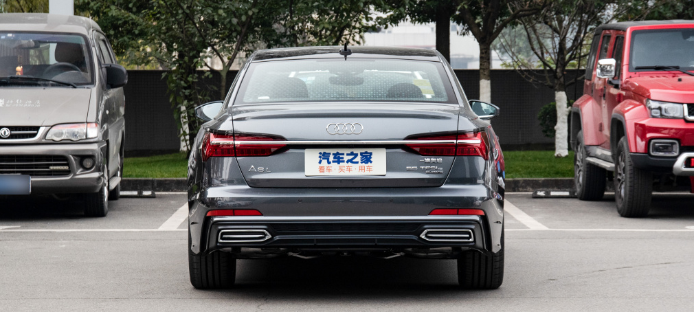 车辆尾部,奥迪A6L插混版用一条贯穿式镀铬条连接两侧尾灯,下包围和尾喉同样采用了镀铬装饰,提升了尾部的精致感,也拓宽了车尾的视觉感。