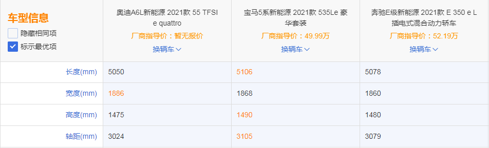 整体来说,奥迪A6L混动的燃油动力表现最好,并且是三款车中唯一的四驱车型。在纯电续航里程方面,2021款奔驰E级混动已经超越了宝马5系混动,达到了120kn。