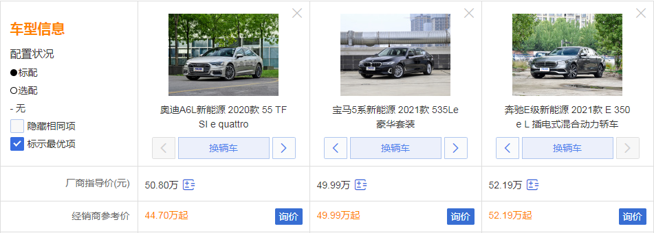 尽管纯电动车是未来的大趋势,但就目前来说,冬季续航里程不稳定、电池寿命短、充电速度慢、配套设施不完善等问题依然没有得到有效解决,纯电动车还有很长的路要走,也正是因为如此,插电混动车型才有了存在的理由。相比油车,插电混动车型可以用纯电动和汽油两种方式行驶,燃油经济性方面更有优势,而且能享受国家新能源优惠政策,所以不少新能源技术储备不足的车企为了应对节能减排的要求,选择了用插电混动车型过度的方式推出新能源车型,今天要说到的宝马5系、奥迪A6L和奔驰E级就是如此。