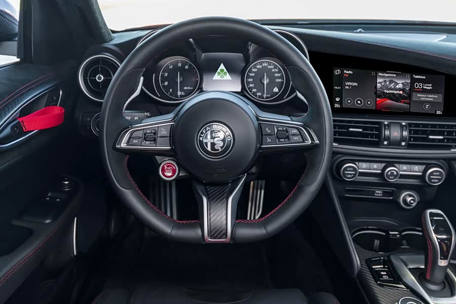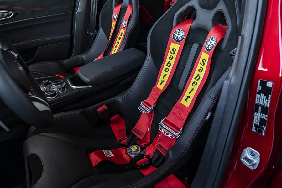 内饰部分,新车采用了大量Alcantara材质进行包裹,搭配三幅式多功能方向盘与拉环式门把手,搭配上机械指针式表盘,极具战斗气息。此外,Giulia GTAm的车厢采用了双座的设定,加入了六点式赛车座椅、防滚架等,其更像是一台可以合法上路的赛车。