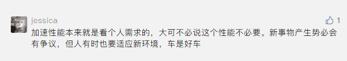 Jessica:加速性能本来就是看个人需求的,大可不必说这个性能不必要。新事物产生势必会有争议,但人有时也要适应新环境,车是好车。