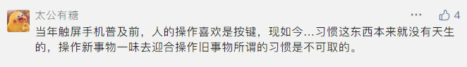 太公有糖:当年触屏手机普及前,人的操作是喜欢按键,现如今……习惯这东西本来就没有天生的,操作新事物一味去迎合操作旧事物所谓的习惯,是不可取的。