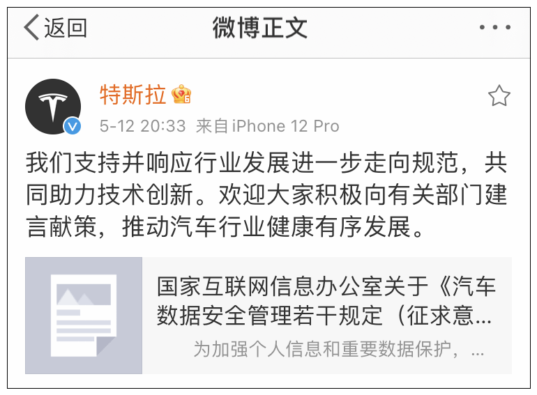 当晚,特斯拉官方微博转发这则新闻,表示“支持并响应”。