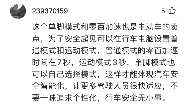 239370159:这个单脚模式和零百加速也是电动汽车的卖点。为了安全起见,可以在行车电脑设置普通模式和运动模式,普通模式的零百加速时间在7秒,运动模式3秒,单脚模式也可以自己选择模式,这样才能体现汽车安全智能化,让更多驾驶人员很快适应。不要一味追求个性化,行车安全无小事。