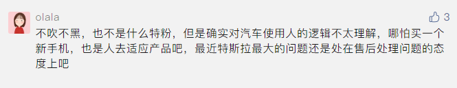 olala:不吹不黑,也不是什么特粉,但确实对汽车使用人的逻辑不太理解,哪怕买一个新手机,也是人去适应产品吧,最近特斯拉最大的问题还是处在售后处理问题的态度上吧