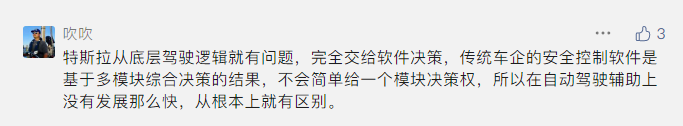 吹吹:特斯拉从底层驾驶逻辑就有问题,完全交给软件决策,传统车企的安全控制软件是基于多模块综合决策的结果,不会简单给一个模块决策权,所以在自动驾驶辅助上没有发展那么快,从根本上就有区别。