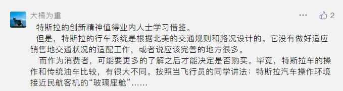 大橘为重:特斯拉的创新精神值得业内人士学习借鉴,但它需要完善的地方还有很多。而作为消费者,可能要更多地了解之后,才能决定是否购买。毕竟,它的操作和传统油车有很大不同。按照当飞行员的同学讲法:特斯拉汽车操作环境接近民航客机的“玻璃座舱”。