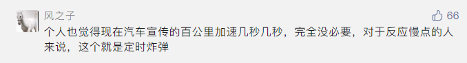 风之子:个人也觉得现在汽车宣传的百公里加速几秒几秒,没必要。对于反应慢点的人来说,这个就是定时炸弹。