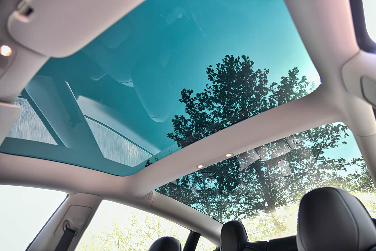 Model 3的车顶配备了不可开启的双段式天幕,这和家族其它成员有所不同,不仅有良好的的采光性,还保证了车身的扭转刚性,对于主打性能的车来说很有必要。天幕隔绝紫外线的效果足够出色,在太阳光直射下不会影响舒适性。