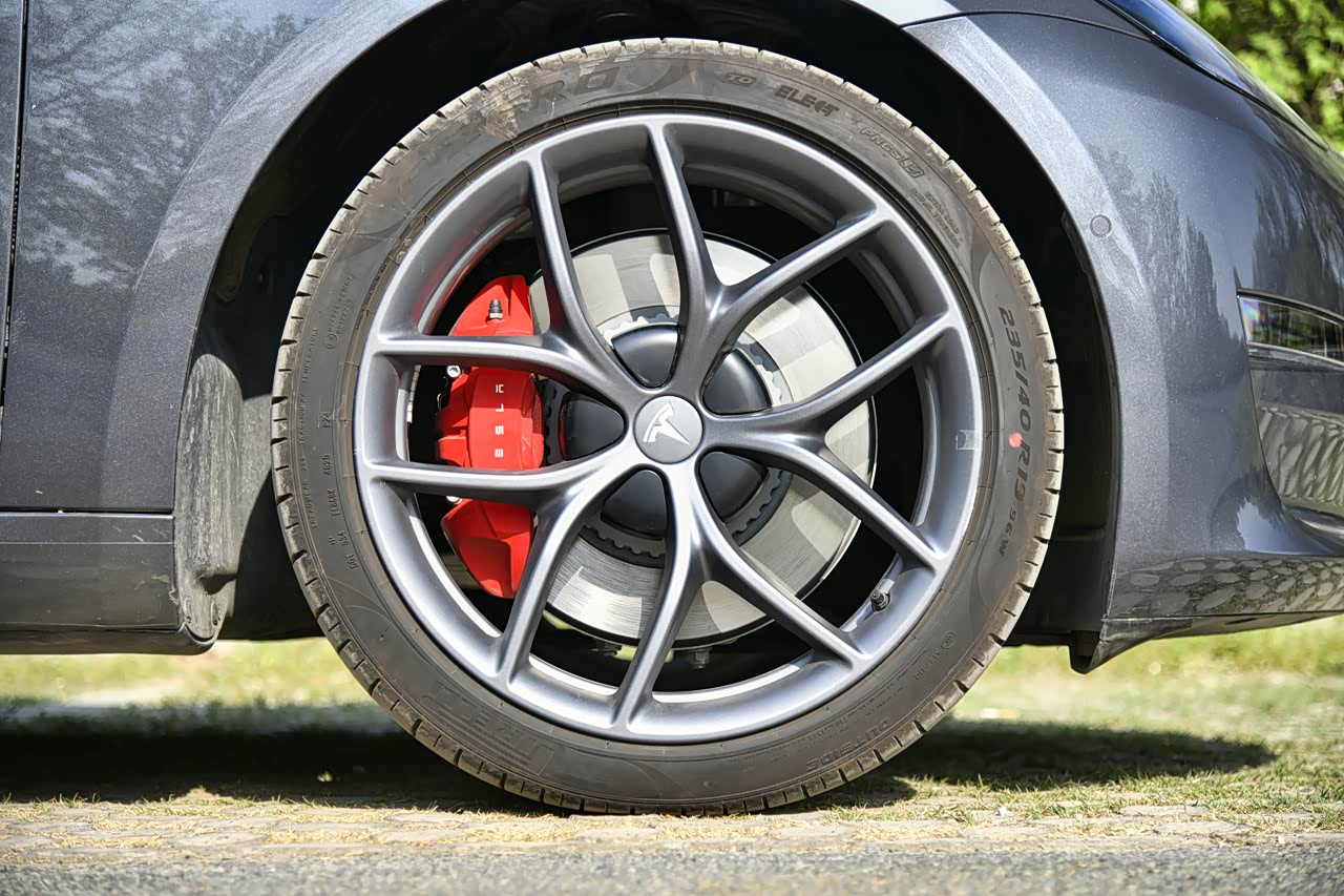 与普通版最明显的区别就是轮圈采用了大面积镂空设计,内部的红色刹车卡钳和刹车盘一览无余,具有很强的战斗气息。与之匹配的是一套倍耐力P-ZERO轮胎,规格为235/40 R19,主打运动性,毕竟一般轮胎镇不住性能版的电动车。