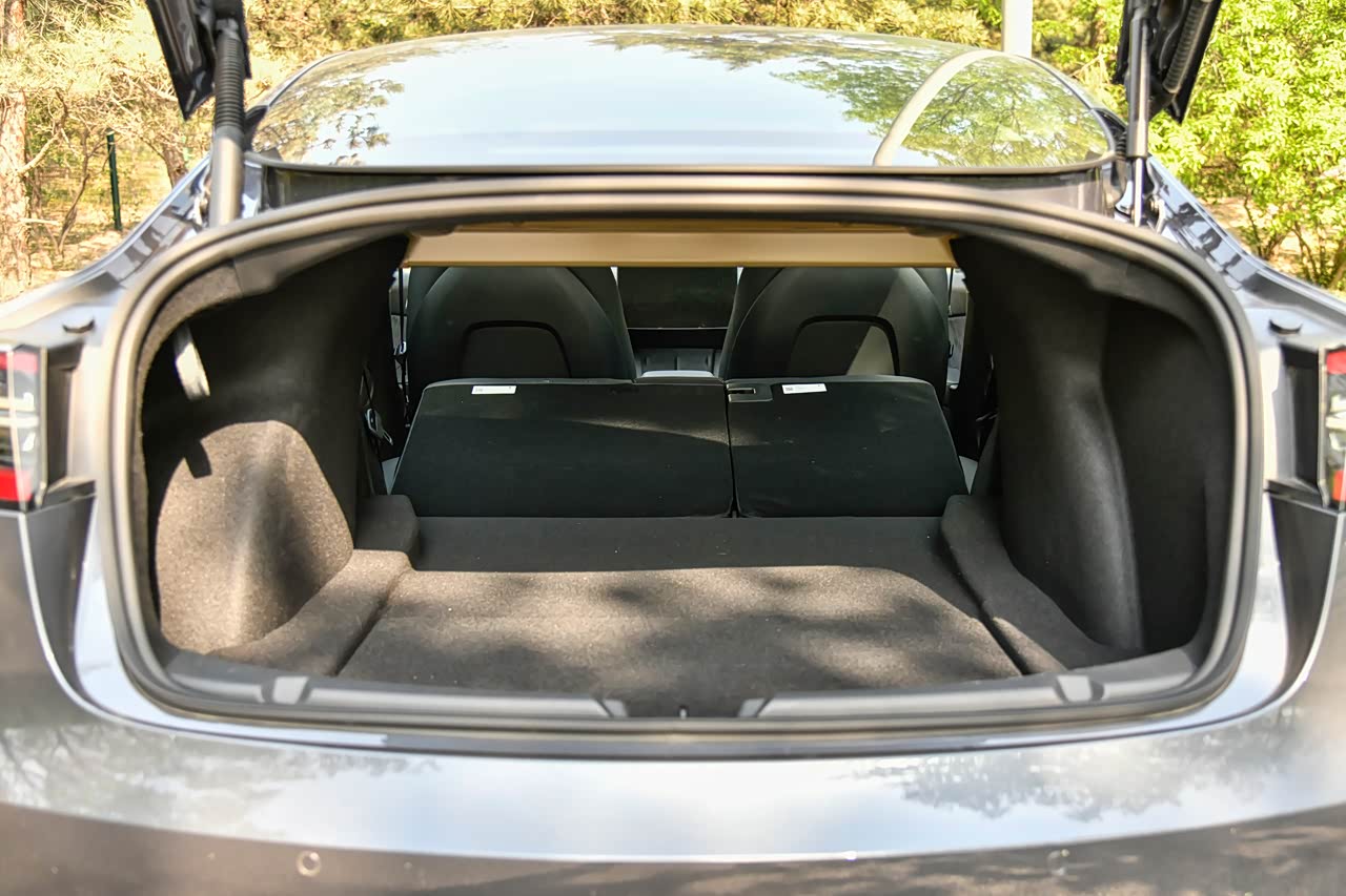 Model 3车身是溜背造型,加上车顶的天幕设计,所以后备厢不能采用掀背的开启方式,装载能力受到了限制。后排座椅支持4/6比例放倒,无法达到纯平状态,不过这种用车场景也不会出现几次,日常出行,前备厢就已经能Hold住了。