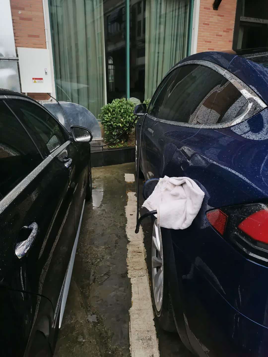 结果,我在酒店的停车场逛了一整圈,发现停车场里面只有一个特斯拉的充电桩,我私下里猜测,这个车位应该是酒店里某位员工或者某位负责人的,可能每天需要开的路程比较长,所以需要在酒店里充电,而且这个车主还在充电口盖了一块毛巾,估计是为了用来挡雨,但实际上根本没这个必要。